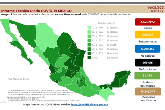 De acuerdo con el Reporte Técnico Diario, la dependencia federal confirmó 12 mil 929 contagios en las últimas 24 horas, para un total de 3 millones 528 mil 972, mientras que los decesos se elevaron en mil 46, con un acumulado de 269 mil 15.