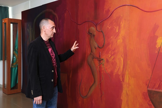 El pintor, que ha expuesto su trabajo en espacios artísticos y culturales de Cuba, Canadá, España, Alemania, Estados Unidos, Perú, Chile, Corea del Norte e Italia, afirmó que este mural, realizado en el año 2018, representa al área de derecho y a la institución.
