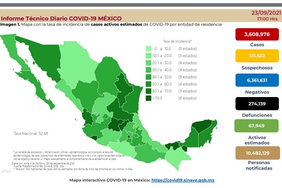 Con ello, se han acumulado 3 millones 608 mil 976 casos y 274 mil 139 defunciones, de acuerdo con el informe técnico diario de la situación de la pandemia.