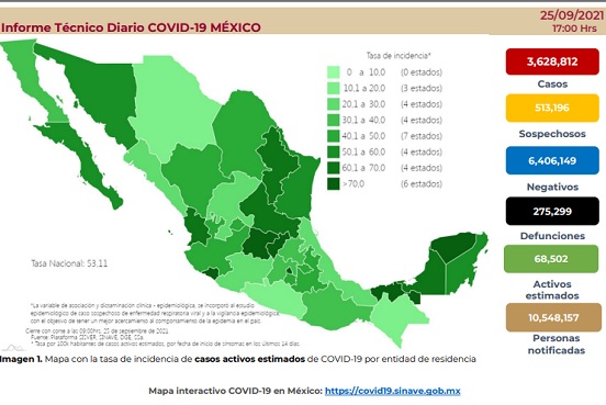 Y hay 10 entidades en donde el 80 por ciento o más de la población ha recibido una vacuna: Baja California con el 80 por ciento, Baja California Sur con el 81 por ciento, Chihuahua con el 81 por ciento, la Ciudad de México con el 93 por ciento, Querétaro con el 92 por ciento, Quintana Roo con el 86 por ciento, San Luis Potosí con el 84 por ciento, Sinaloa con el 86 por ciento, Tamaulipas, con el 81 por ciento, y Yucatán con el 85 por ciento.