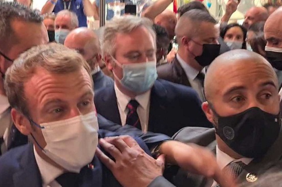El huevo rebotó en el hombro de Macron sin romperse y el individuo fue rápidamente reducido por el servicio de seguridad del mandatario.