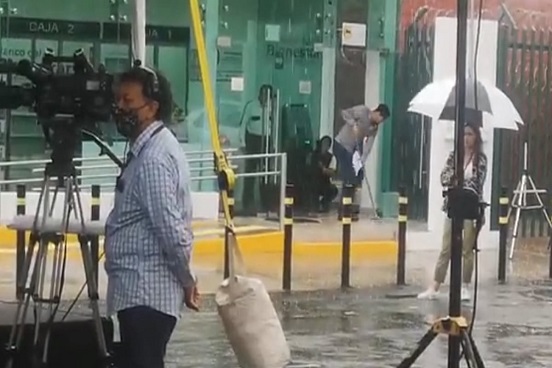 En la grabación se observa cómo los elementos de ayudantía laboran con trapeadores, jaladores y escobas para sacar apresuradamente el agua encharcada en la sucursal bancaria, mientras el evento, en el cual también participó la mandataria capitalina Claudia Sheinbaum se realiza ante pocos asistentes.