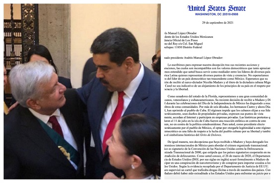Rubio, de origen cubano, y Scott consideraron que López Obrador incumplió compromisos internacionales sobre crimen organizado trasnacional al no detener a Maduro cuando asistió a la cumbre de la Comunidad de Estados Latinoamericanos y Caribeños (Celac), realizada en Ciudad de México el 18 de septiembre.