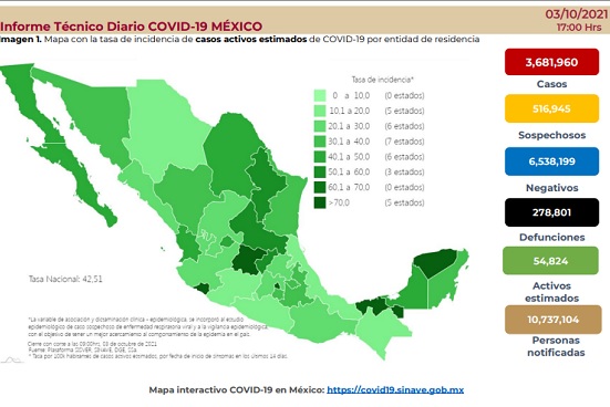 En las pasadas 24 horas se confirmaron 2 mil 980 casos de Covid-19 y 209 fallecimientos, con lo que las cifras acumuladas de ambos indicadores se ubicaron en 3 millones 681 mil 960 y 278 mil 801, respectivamente, indica el reporte técnico de la Secretaría de Salud (SSa).