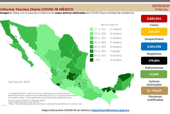 El reporte de esta tarde indica que los casos activos son 47 mil 569. Se trata de las personas que la dependencia federal estima que iniciaron con síntomas de la infección por coronavirus en los pasados 14 días.