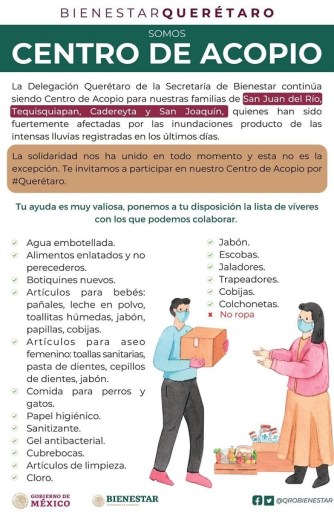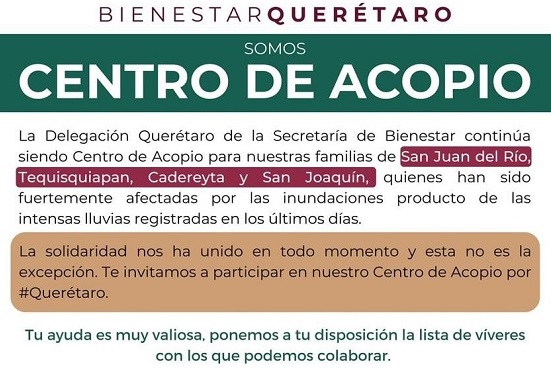 La Secretaría del bienestar habilitó un centro de acopio en sus oficinas de la calle estadio, en Querétaro, para apoyar a las familias afectadas por las lluvias en los diferentes municipios.