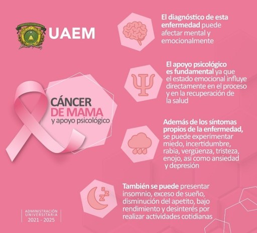 Las mujeres diagnosticadas con cáncer de mama también tienen afectaciones en su salud mental y emocional, por lo que el acompañamiento psicológico y, en algunos casos, psiquiátrico debe ser parte del tratamiento médico, afirmó la responsable del Área de Psicología de la Clínica Multidisciplinaria de Salud de la Universidad Autónoma del Estado de México (UAEM), Francisca Aurelia Ruiz Vázquez.