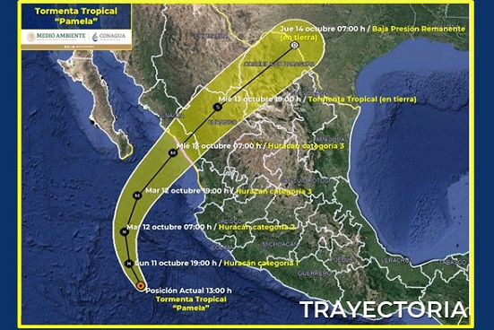 Asimismo, el SMN informó que que se prevé que Pamela evolucione a huracán categoría 1 en las próximas horas y podría alcanzar la categoría 3 antes de impactar en las costas mexicanas del Océano Pacífico que podría ser entre el próximo martes o miércoles.
