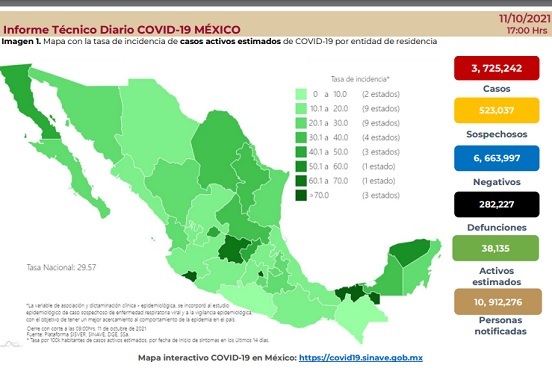 En torno a la pandemia activa, se reporta en 38 mil 135 personas, siendo la Ciudad de México, Guanajuato, Estado de México y Tabasco, las entidades que tienen más casos positivos que iniciaron síntomas en los últimos 14 días.