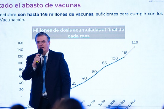 En el marco de la conferencia de prensa matutina que encabeza el presidente Andrés Manuel López Obrador, el secretario de Relaciones Exteriores, Marcelo Ebrard Casaubon, informó que México acumulará hasta 146 millones de vacunas a finales de octubre, cumpliendo así con los objetivos del Plan Nacional de Vacunación.