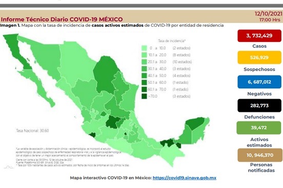 Este martes México reportó un total de 3 millones 732 mil 429 casos de Covid-19, de los cuales 7 mil 187 se reportaron en las últimas 24 horas; en tanto, 282 mil 773 personas, han perdido la vida como consecuencia de esta enfermedad, y de ellas 546 fueron reportadas de lunes a martes.