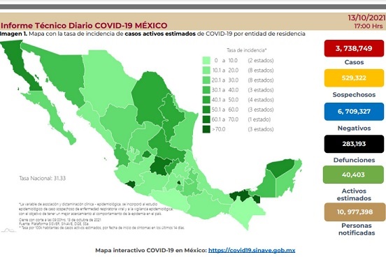 La pandemia activa se ubica en 40 mil 403 personas, siendo la Ciudad de México, Guanajuato, Estado de México y Tabasco, las entidades con más casos positivos que iniciaron síntomas en los últimos 14 días.
