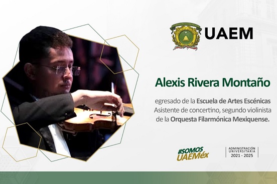 Alexis Rivera Montaño, egresado de la Escuela de Artes Escénicas de la Universidad Autónoma del Estado de México (UAEM), fue elegido como asistente de concertino de la Orquesta Filarmónica Mexiquense (OFM).