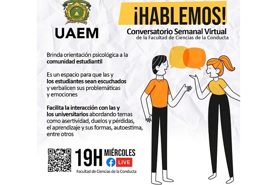 Ante la necesidad de canalizar adecuadamente las emociones y problemáticas por las que atraviesa la comunidad estudiantil a consecuencia del confinamiento sanitario por la COVID-19, la Facultad de Ciencias de la Conducta de la Universidad Autónoma del Estado de México (UAEM) impulsa el conversatorio “Hablemos”, que se transmite semanalmente a través de Facebook y en el cual se abordan diversos tópicos de interés para la comunidad estudiantil de la institución.