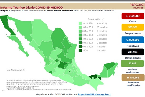 En tanto, se reportaron 4 mil 220 contagios entre lunes a martes, confirmados por laboratorio, con lo que el total de casos en México es de 3 millones 762 mil 689.