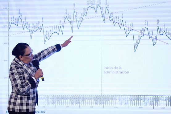 La secretaria agregó que el robo en general tiene una baja de 22.5 por ciento, si se toman como referencia los primeros nueve meses de 2019 contra el mismo periodo de 2021.