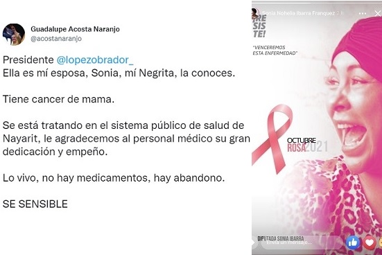 «Presidente @lopezobrador_ Ella es mí esposa, Sonia, mí Negrita, la conoces. Tiene cáncer de mama. Se está tratando en el sistema público de salud de Nayarit, le agradecemos al personal médico su gran dedicación y empeño. Lo vivo, no hay medicamentos, hay abandono. SE SENSIBLE.», escribió.