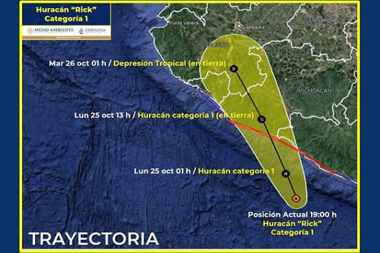 El Servicio Meteorológico Nacional (SMN) informó que el centro del huracán Rick se localiza muy cerca de las costas de Michoacán y Guerrero, y prevé que tocará tierra a las 13 horas del lunes.