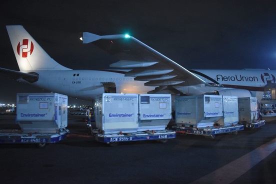A las 00:47 h de este lunes, arribó a la terminal 1 del Aeropuerto Internacional de la Ciudad de México (AICM) «Benito Juárez», el décimo octavo embarque de vacunas envasadas contra COVID-19 de AstraZeneca con un millón 090 mil 900 dosis, en el vuelo RU501 de la aerolínea AeroUnion, procedente de Chicago, Illinois, Estados Unidos.