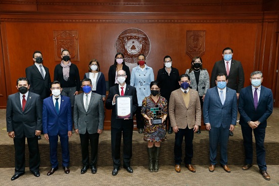 En representación del rector de la UAEM, Carlos Eduardo Barrera Díaz, la secretaria de Administración de esta casa de estudios, Eréndira Fierro Moreno, recibió la presea entregada en el marco de las actividades del “Encuentro Virtual ANUIES-TIC UDLAP 2021”.