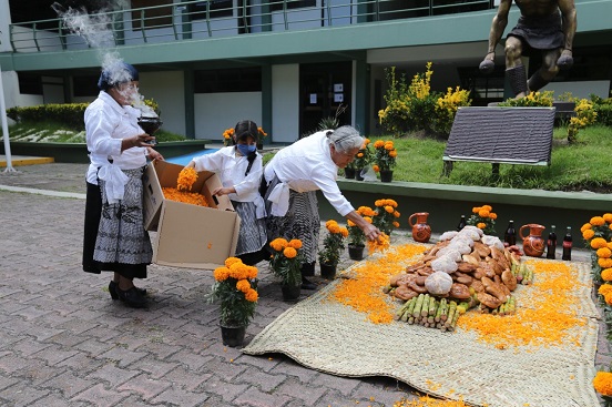 “Tradicionalmente, la ofrenda la montaban las y los estudiantes. Ahora, con el propósito de afianzar el acercamiento con los grupos originarios, principalmente del Estado de México, decidimos invitar a este grupo de mujeres para que nos compartieran el conocimiento y sabiduría que poseen y que trasmiten de generación en generación”, afirmó.