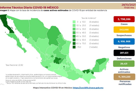 Así, se han acumulado 3 millones 798 mil casos y 287 mil 631 defunciones desde que inició la emergencia sanitaria.