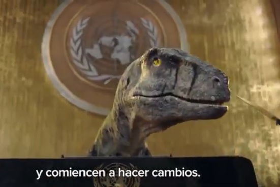 El video es parte de una campaña de concientización y en este se observa al dinosaurio tomar el podio de la Asamblea General para comenzar a dar su charla.