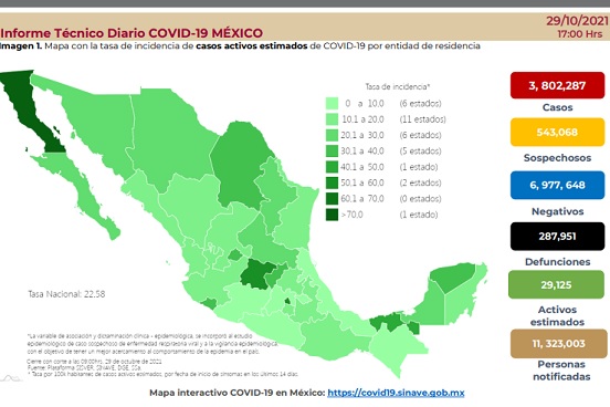 Se estima que hay 29 mil 125 casos activos en el país, es decir, personas que iniciaron con síntomas en los últimos 14 días. Esto representa una baja del 15 por ciento respecto a la semana anterior.