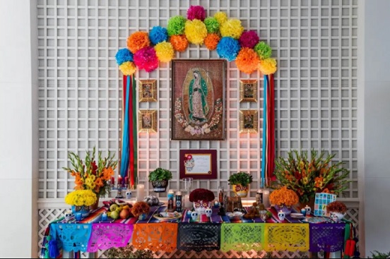 Añadió que el personal de la Casa Blanca aportó los cuatro cuadros de ángeles colocados a los lados de la Virgen, y los artefactos y accesorios en la ofrenda, en la que abundan las calaveras y las velas.