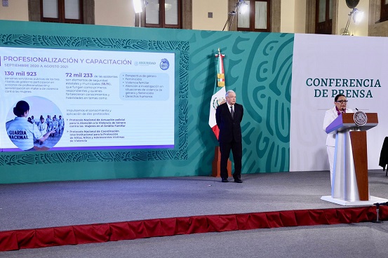 Este miércoles, en la conferencia matutina del presidente Andrés Manuel López Obrador, la secretaria de Seguridad presentó el informe sobre violencia de género junto con la titular de la Comisión Nacional para Prevenir y Erradicar la Violencia contra las Mujeres (Conavim), Fabiola Alanís Sámano, y la presidenta del Instituto Nacional de las Mujeres (Inmujeres), Nadine Gasman Zylbermann.