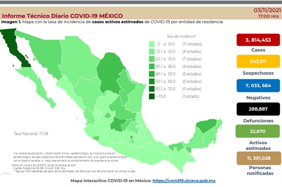 En las pasadas 24 horas se confirmaron 2 mil 660 casos de Covid-19 y 154 decesos, con lo que hasta hoy, la Secretaría de Salud tiene registro de 3 millones 814 mil 453 personas que han tenido la enfermedad y 288 mil 887 que han fallecido por esa causa.