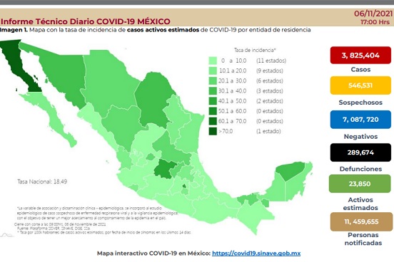 Con ello se han acumulado 3 millones 825 mil 404 casos desde que inició la pandemia y 289 mil 674 defunciones.