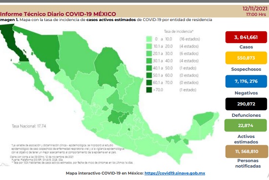 El semáforo publicado este viernes por la Secretaría de Salud (SSa) y que estará vigente del 15 al 28 de noviembre indica que 31 entidades estarán en verde, o nivel de riesgo bajo, ninguna en amarillo, o riesgo medio, ni en rojo, o riesgo máximo.