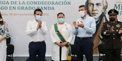 Rutilio Escandón y Zoé Robledo entregan Condecoración Miguel Hidalgo en Grado Banda a personal de salud