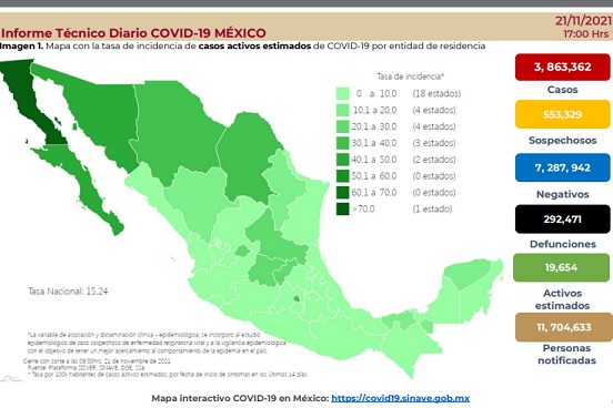 Informó que al comenzar la semana epidemiológica 45, hay un descenso de 17 por ciento de los casos de covid-19, y en el país hay 19 mil 654 casos activos estimados de la enfermedad.