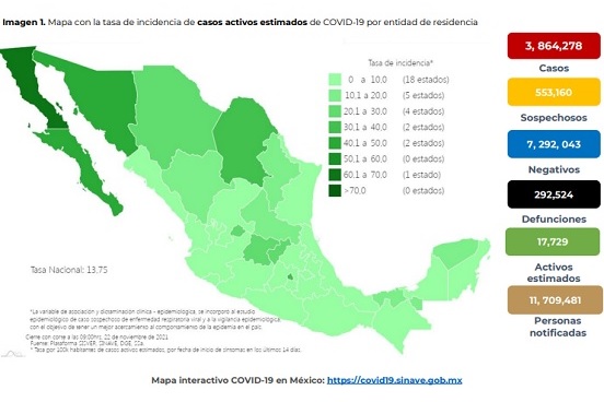 La tendencia de la curva epidémica se mantiene con una disminución de menos 17 por ciento en el periodo del 7 al 13 de noviembre, en comparación con la semana previa.