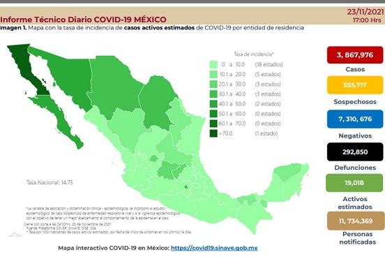 A pesar que la reducción de casos estimados de Covid-19 fue de menos 14 por ciento para el periodo del 7 al 13 de noviembre en comparación con la semana previa, la Secretaría de Salud (Ssa) reportó 3 mil 698 nuevos casos en las últimas 24 horas, para un total de 3 millones 867 mil 976 contagios, mientras que los decesos se incrementaron en 326, con un acumulado de 292 mil 850.