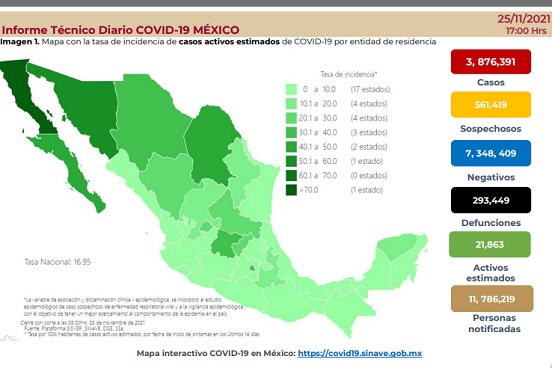 El Reporte Técnico Diario sobre el estado de la pandemia de Covid-19 en México reportó 4 mil 128 casos confirmados en las últimas 24 horas, para un total de 3 millones 876 mil 391, mientras que los decesos se incrementaron en 263, para un acumulado de 293 mil 449.