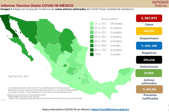 En tanto, la epidemia activa se ubica en 20 mil 906 personas, siendo la Ciudad de México con 3 mil 147 casos, seguida de Baja California con 2 mil 877, Sonora con mil 728, Guanajuato con mil 648 y Chihuahua con mil 365, las entidades con mayor número de casos activos con síntomas reportados en los últimos 14 días.