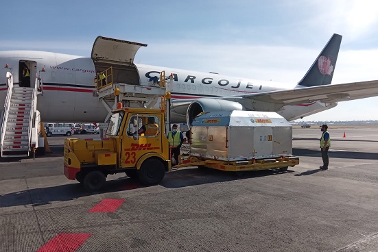 A las 09:20 h llegó a la terminal 1 del Aeropuerto Internacional de la Ciudad de México (AICM) «Benito Juárez», el vuelo CJT 952, proveniente de Cincinnati, Estados Unidos. En el arribo, traslado y seguridad de las vacunas participaron 48 elementos del Ejército Mexicano.