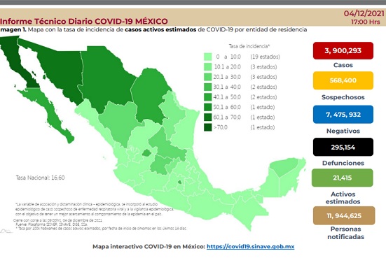 El reporte técnico diario de la Secretaría de Salud sobre la evolución de la pandemia destaca que la curva epidémica registra un incremento de casos del 10 por ciento para el periodo del 14 al 20 de noviembre, en comparación con la semana epidemiológica previa.