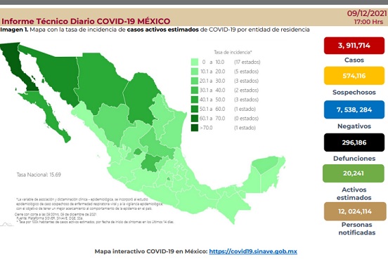 El Reporte Técnico Diario sobre el estado de la pandemia en el país reporta una reducción de menos 13 por ciento en la curva epidémica para el periodo del 21 al 27 de noviembre, en comparación con la semana previa. Pese a ello, los casos activos estimados, es decir, con capacidad de transmisión, se mantienen por arriba de los 20 mil.