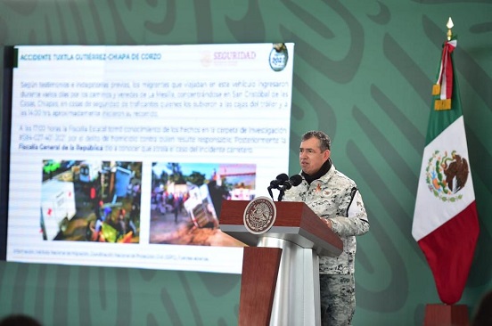 Durante la conferencia mañanera del presidente Andrés Manuel López Obrador, realizada en esa ocasión desde el estado de Chihuahua, el titular de la Guardia Nacional, el general Luis Rodríguez Bucio dio a conocer los detalles del accidente de ayer en Chiapas donde 54 migrantes fallecieron y 105 resultaron lesionados, de los cuales 83 son hombres y 22 mujeres. En la conferencia matutina de la Presidencia de la República, Bucio expresó que entre los lesionados hay también 19 menores de edad.