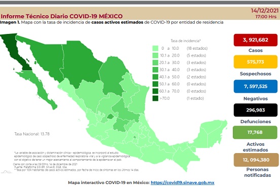 En tanto, la pandemia activa se ubica en 17 mil 768 personas, siendo Baja California con 2 mil 968 casos, Ciudad de México con 2 mil 241, Guanajuato con mil 544, Chihuahua con mil 465 y Sonora con mil 318, las entidades con mayor número de casos activos que reportaron síntomas en los últimos 14 días.