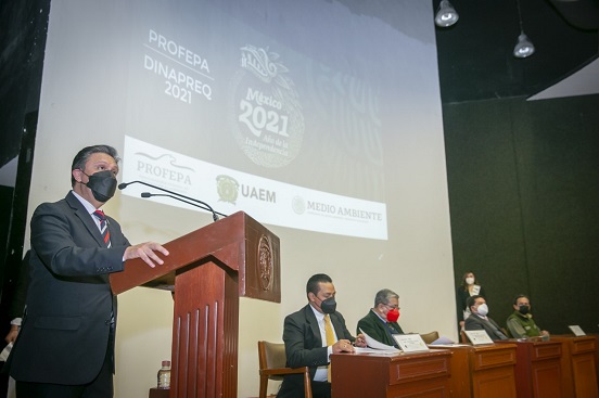 Durante la entrega de reconocimientos del Día Nacional de la Preparación y Respuesta a Emergencias Químicas (DINAPREQ) 2021 de la Procuraduría Federal de Protección al Ambiente (PROFEPA) que tuvo como sede el Auditorio “José Yurrieta Valdés” del Edificio Administrativo de la UAEM, Cienfuegos Terrrón externó que para esta casa de estudios es de relevancia generar una cultura ambiental sobre el manejo de productos que puedan resultar nocivos para la salud de las personas.