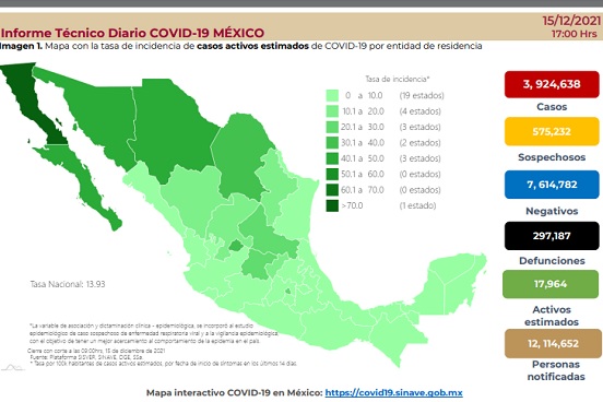 La pandemia activa se ubica en 17 mil 964 personas, siendo Baja California con 3 mil dos casos, seguida de la Ciudad de México con 2 mil 222, Guanajuato con mil 640, Chihuahua con mil 537 y Sonora con mil 361, las entidades con mayor número de casos activos que reportaron síntomas en los últimos 14 días.