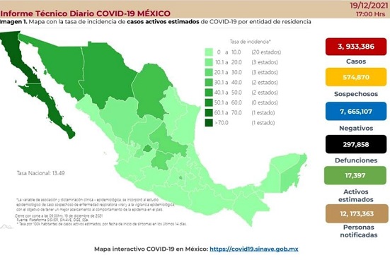 En 24 horas se reportó la muerte de 23 personas por complicaciones relacionadas con el Covid-19 en México con lo que se llega a 297 mil 858 defunciones, los casos confirmados incrementaron en 841 para un acumulado de 3 millones 933 mil 386, mientras que se estima que hay 17 mil 397 casos activos.