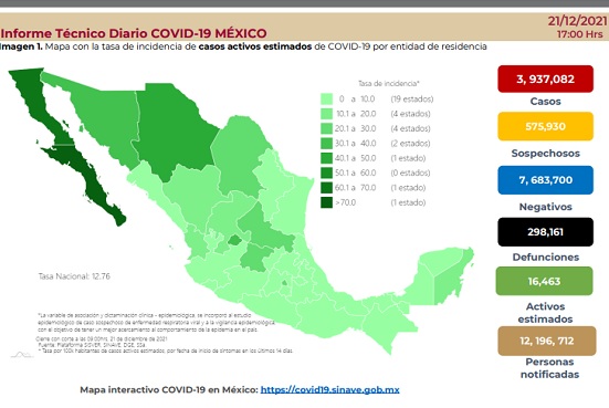 Con una reducción de menos 17 puntos porcentuales, la curva epidémica de contagios de Covid-19 en México, mantiene su tendencia a la baja para el periodo del 5 al 11 de diciembre, en comparación con la semana previa, aunque la Secretaría de Salud (Ssa) reportó esta noche 2 mil 980 nuevos casos en las últimas 24 horas, con un total de 3 millones, 937 mil 82. Los decesos también se incrementaron en 245, con un acumulado de 298 mil 161 fallecimientos confirmados por laboratorio desde marzo de 2020.