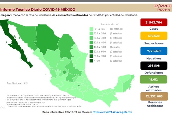 Hasta este jueves se han presentado en el país 3 millones 943 mil 764 casos de covid, lo cual significa 3 mil 363 más casos que el miércoles, y se han registrado 298 mil 508 decesos, 149 más que el día previo, reportó la Secretaría de Salud. Informó que este día suman 19 mil 612 los casos activos estimados, esto es mil 681 más casos que el miércoles.