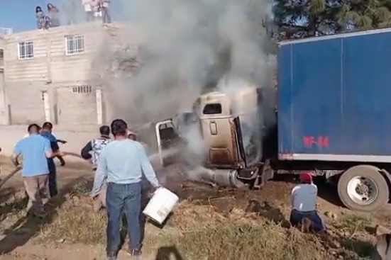 Tras el choque, parte de la cabina del tráiler comenzó a incendiarse por lo que vecinos del lugar apoyaron con cubetas de agua y extintores a sofocar el fuego.